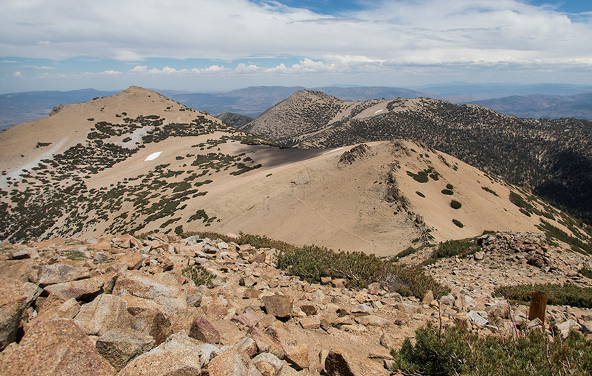 After approximately 3 miles you’ll reach a small saddle between Trimmer Peak (nearer Lake Tahoe) and Freel Peak.